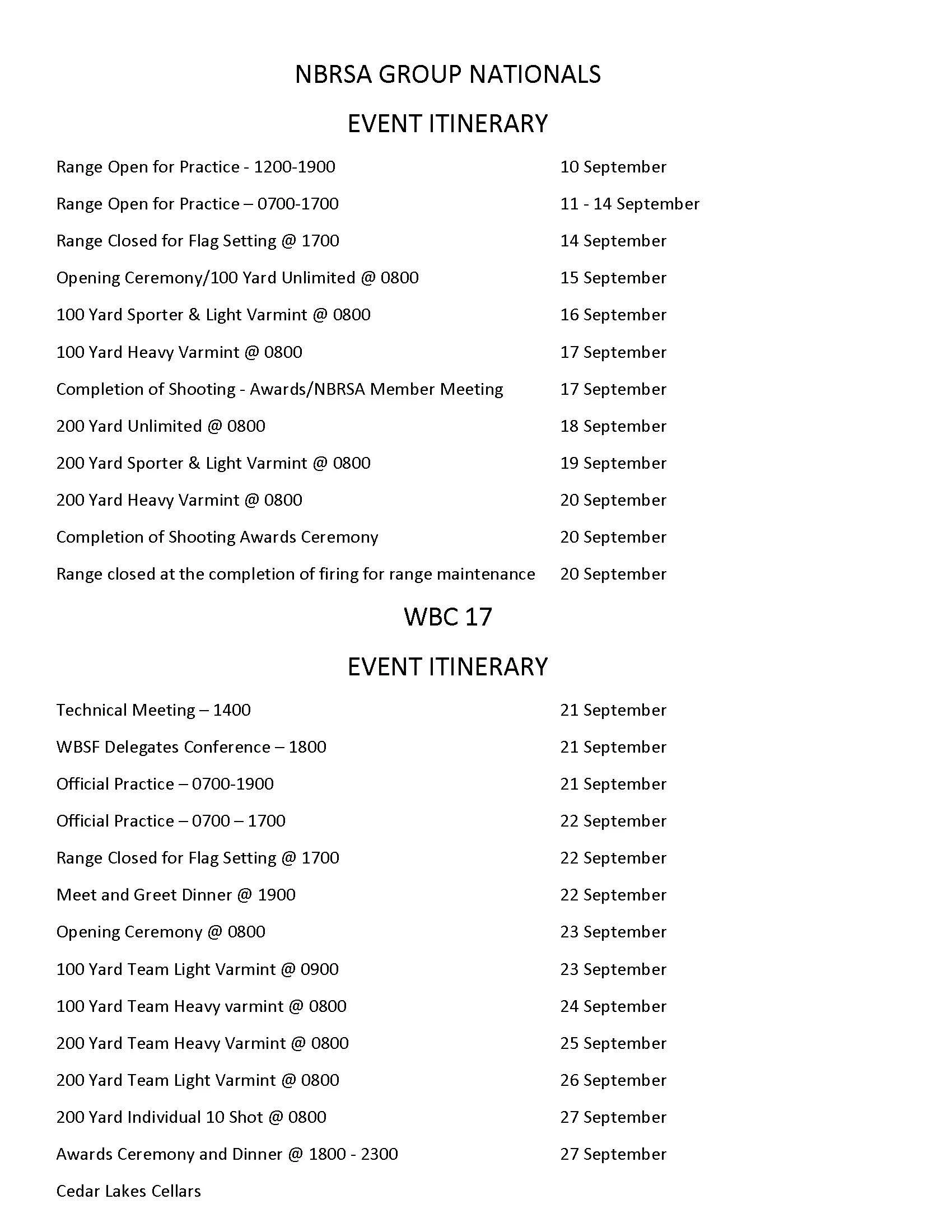 Below you will find the Event Itinerary for both the WBC 17 and NBRSA Group Nationals Events.